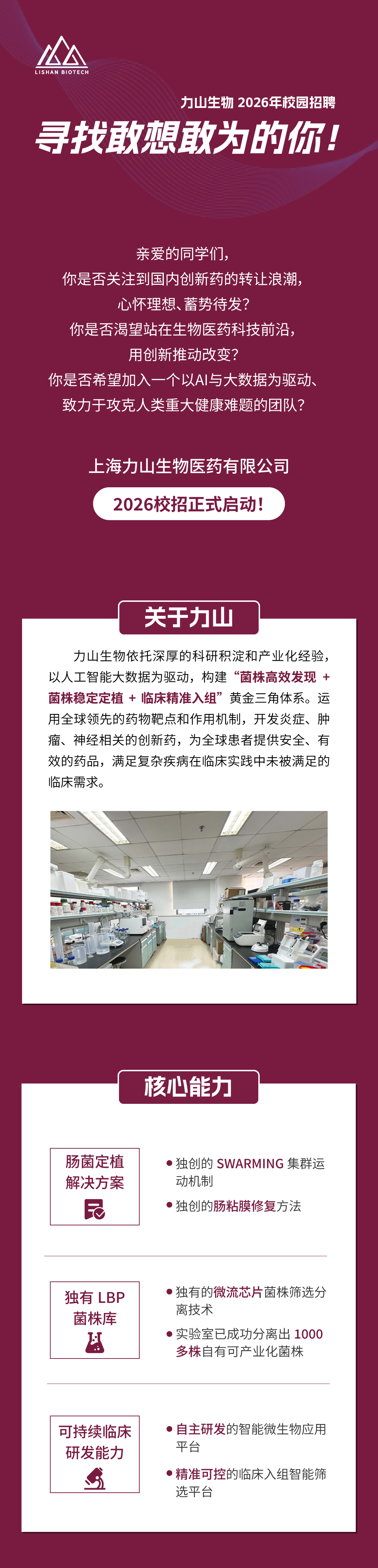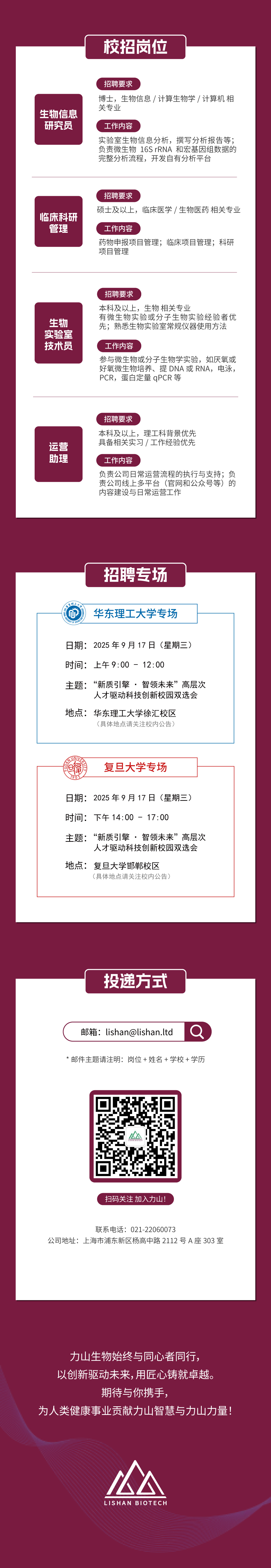 亲爱的同学们,你是否关注到近期国内创新药领域的转让热潮,心怀理想、蓄势待发?你是否渴望站在生物医药科技的前沿,以创新之力推动世界改变?你是否期待加入一个以人工智能与大数据为驱动、致力于攻克人类重大健康挑战的团队?上海力山生物医药有限公司2026校园招聘现已正式启动!我们正在寻找敢于梦想、勇于行动的你们,与我们一同在生命科学的星辰大海中,携手书写新的传奇。