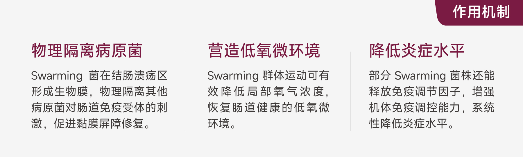 Swarming是一种细菌运动表型,表现为群体协作的迁移行为,并伴随菌体形态与代谢通路的适应性变化。在肠道炎症环境中,高浓度活性氧、黏膜破损形成的粗糙界面以及出血导致的高铁离子浓度,共同诱导兼性厌氧型Swarming菌富集,使其成为肠道炎症的潜在生物标志物。实验表明,与Swarming表型敲除的菌株相比,天然Swarming菌株在缓解肠道炎症方面效果更为显著。目前,Swarming技术已在LS-LBP-001管线中应用于克罗恩病的治疗。
